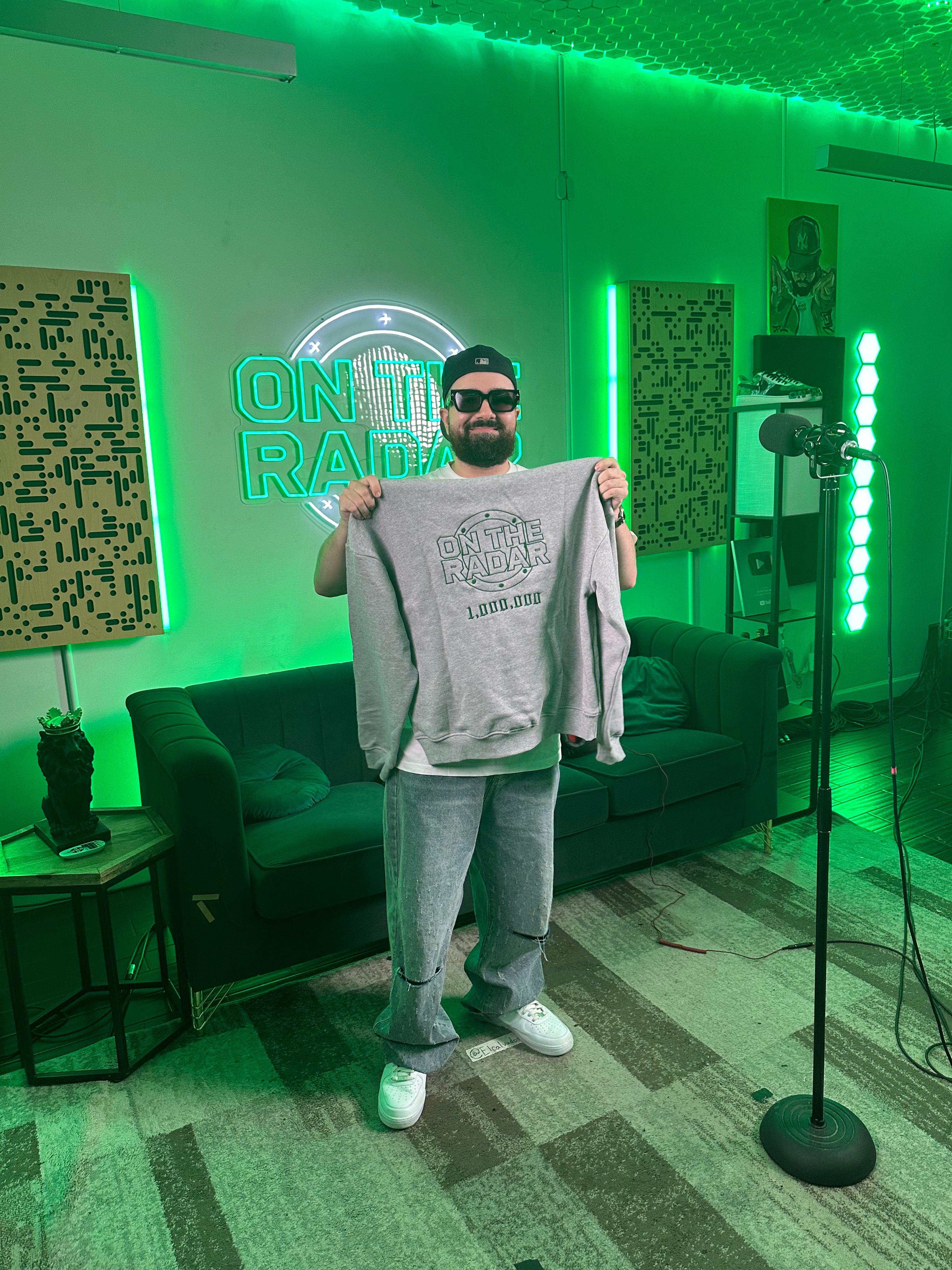 Gabe P, owner of On The Radar Radio showcasing his Eclipse Black Tracksuit and Heather Grey Hoodie as seen on the OTR Dababy Freestyle