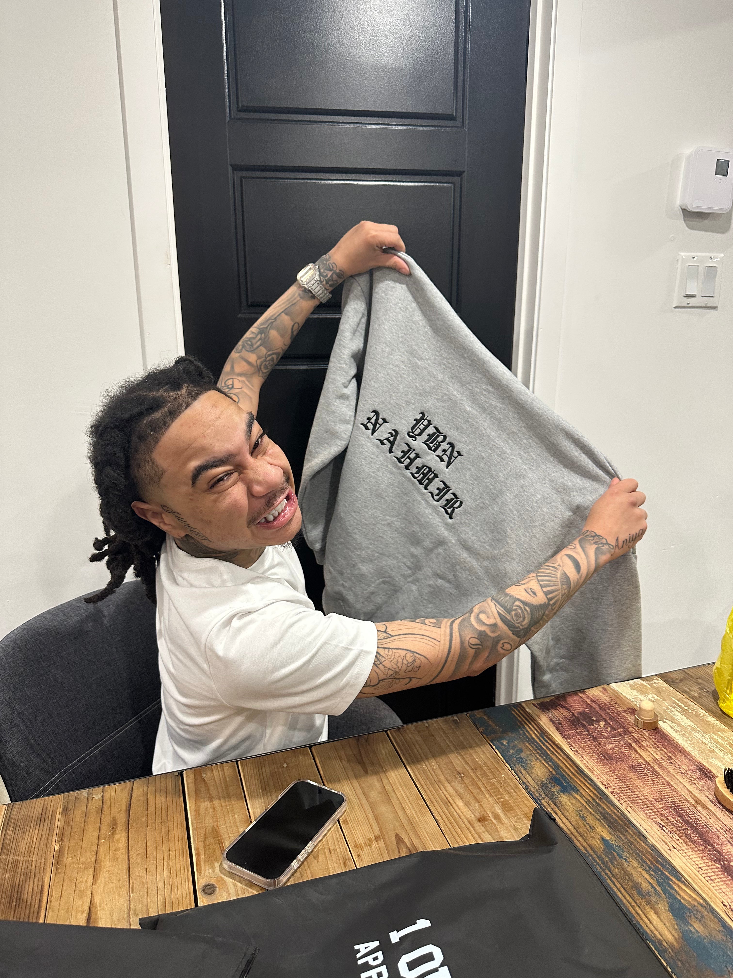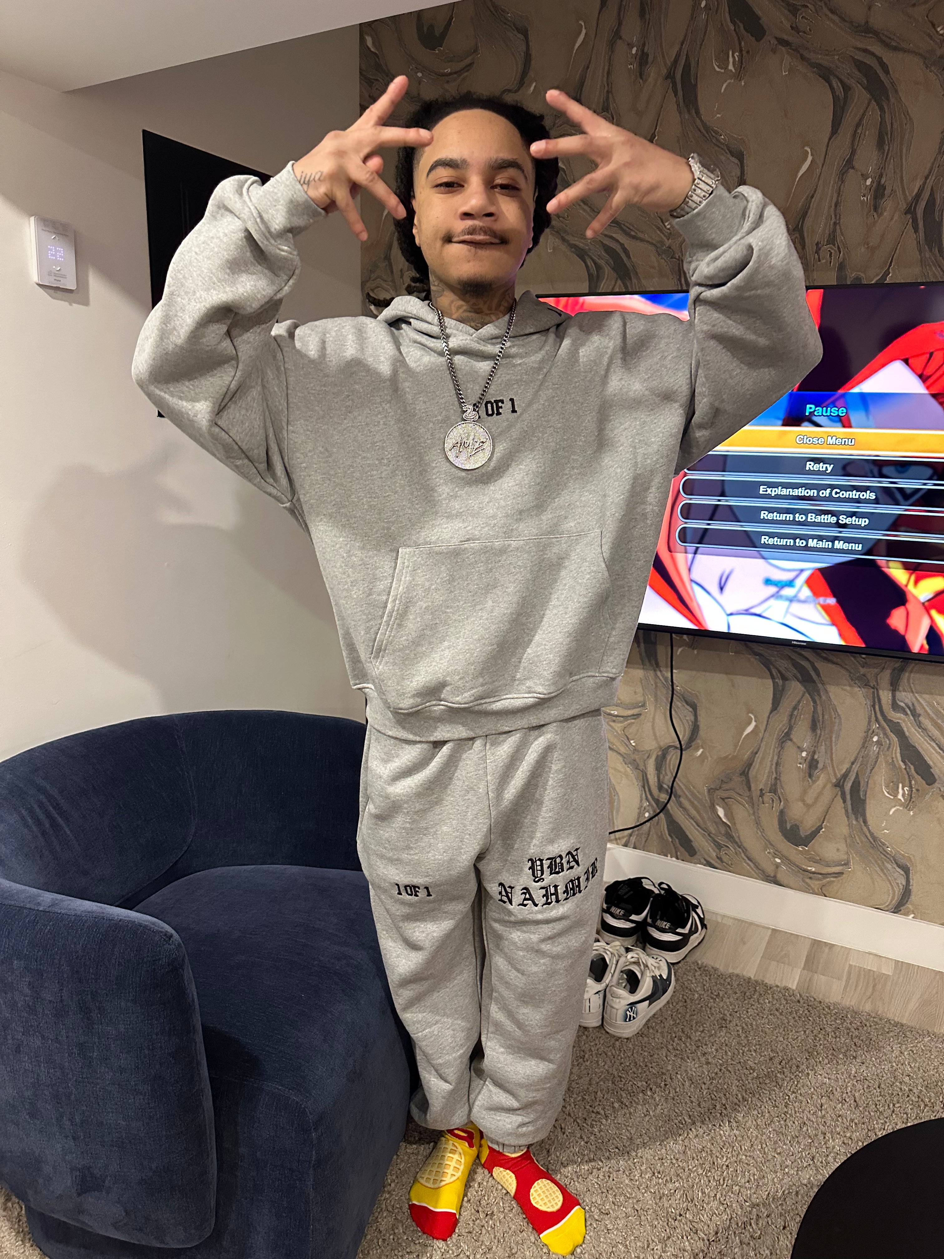 YBN Nahmir unboxing and rocking his customized Heather Grey Tracksuit